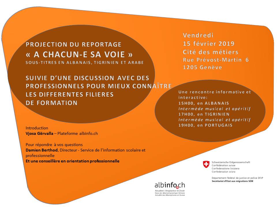 Grâce à la projection de notre vidéo ((en albanais, en tigrinien et en arabe) ainsi qu’à la présence des orienteurs professionnels, les parents pourront s’informer et poser toutes leurs questions concernant la situation de leurs propres enfants.