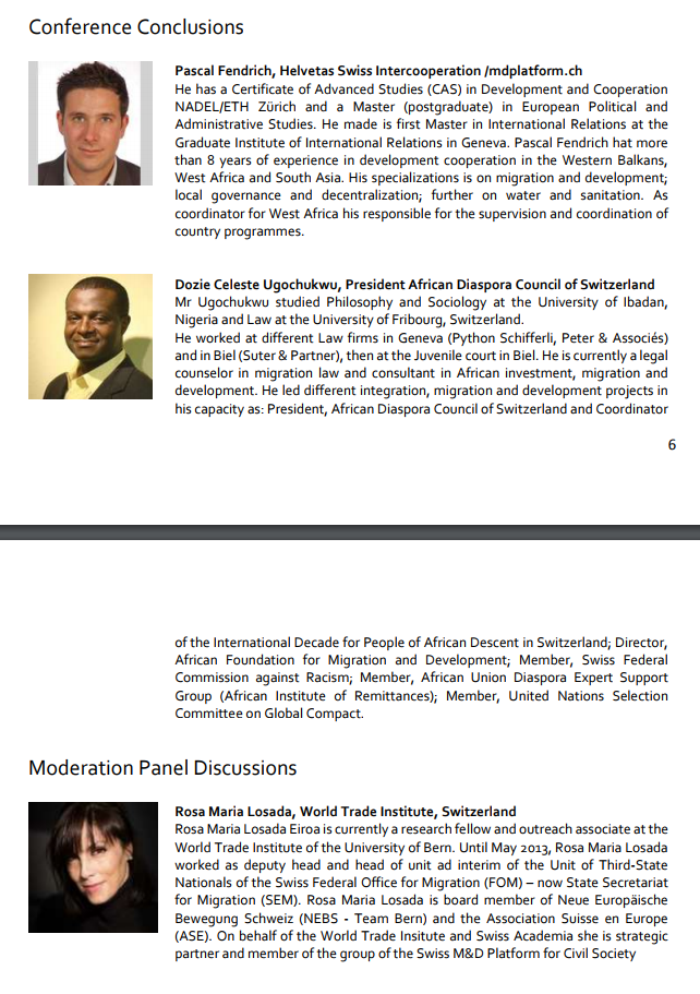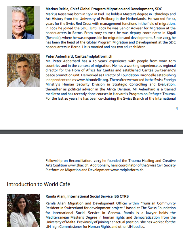 Cette première conférence nationale de mdplatform.ch vise à éclairer la relation entre migration et développement. Elle présentera l’état actuel de la discussion sur ce thème et permettra de discuter des priorités futures pour les acteurs suisses. La conférence vise également à promouvoir l’échange d’expériences de la société civile dans le domaine de la migration et du développement, ainsi qu’à renforcer le rôle des migrants en tant qu’acteurs du développement.