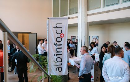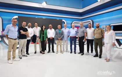 Un groupe de personnalités albano-suisses entrepreneurs, médecins et banquiers accompagné de...