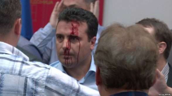 Une foule nationaliste, proche parti conservateur macédonien VMRO-DPMNE, est entrée sans difficultés dans le bâtiment du Parlement de Macédoine, après que la nouvelle coalition interethnique, composée de Socio-Démocrates de Macédoine (SDSM), de l’Union pour l’Intégration Démocratique pour l’Intégration (BDI) et l’Alliance pour les Albanais, a élu, à la tête du Parlement, Talat Xhaferi, Albanophone issu de BDI. Dans ce chaos, ont notamment subi des violences physiques les leaders de SDSM ( Zoran Zaev) et de l’Alliance pour les Albanais ( Ziadin Sela).