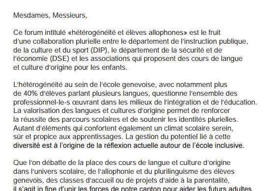 Ce forum met en avant l’importance de la langue comme vecteur culturel et de savoirs. Il devrait déboucher sur une collaboration renforcée entre les divers acteurs œuvrant pour l’intégration des jeunes migrant-e-s scolarisés dans le canton de Genève.