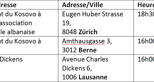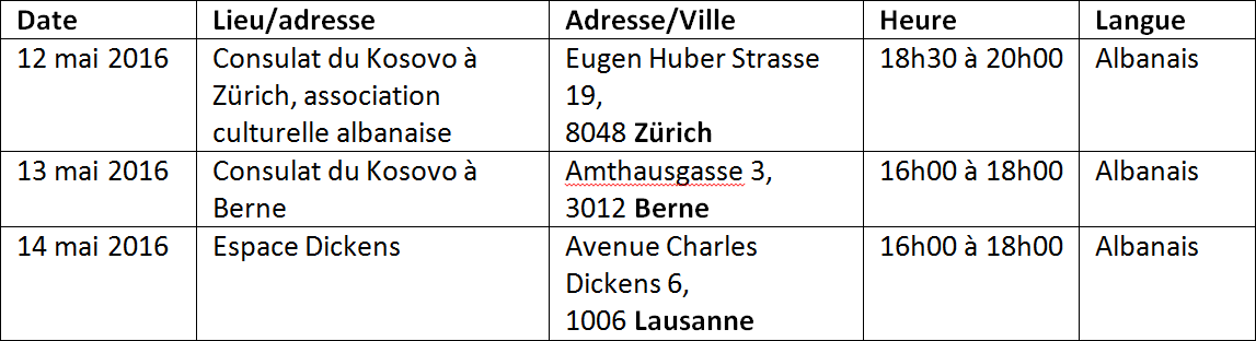 - Lieu12 mai -Zürich, 13 mai-Bern, 14 mai-Lausanne