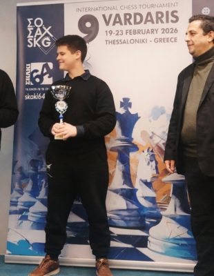Le 23 février 2026, à Thessalonique, s’est déroulé le Tournoi international d’échecs “Vardaris 2026”, où le jeune talent de 12 ans Jon Fejzullahu, originaire de Skopje (Macédoine du Nord), s’est classé premier dans la catégorie C, réservée aux joueurs ayant un classement jusqu’à 1600 points.