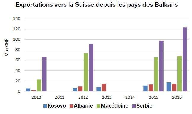 En 2016, la Suisse a importé des marchandises du Kosovo pour environ 17 millions de francs et de l'Albanie, pour une valeur d’environ 13 millions. Parallèlement, les importations de Macédoine s’élevaient à 67 millions de francs, et à 123 millions, pour la Serbie