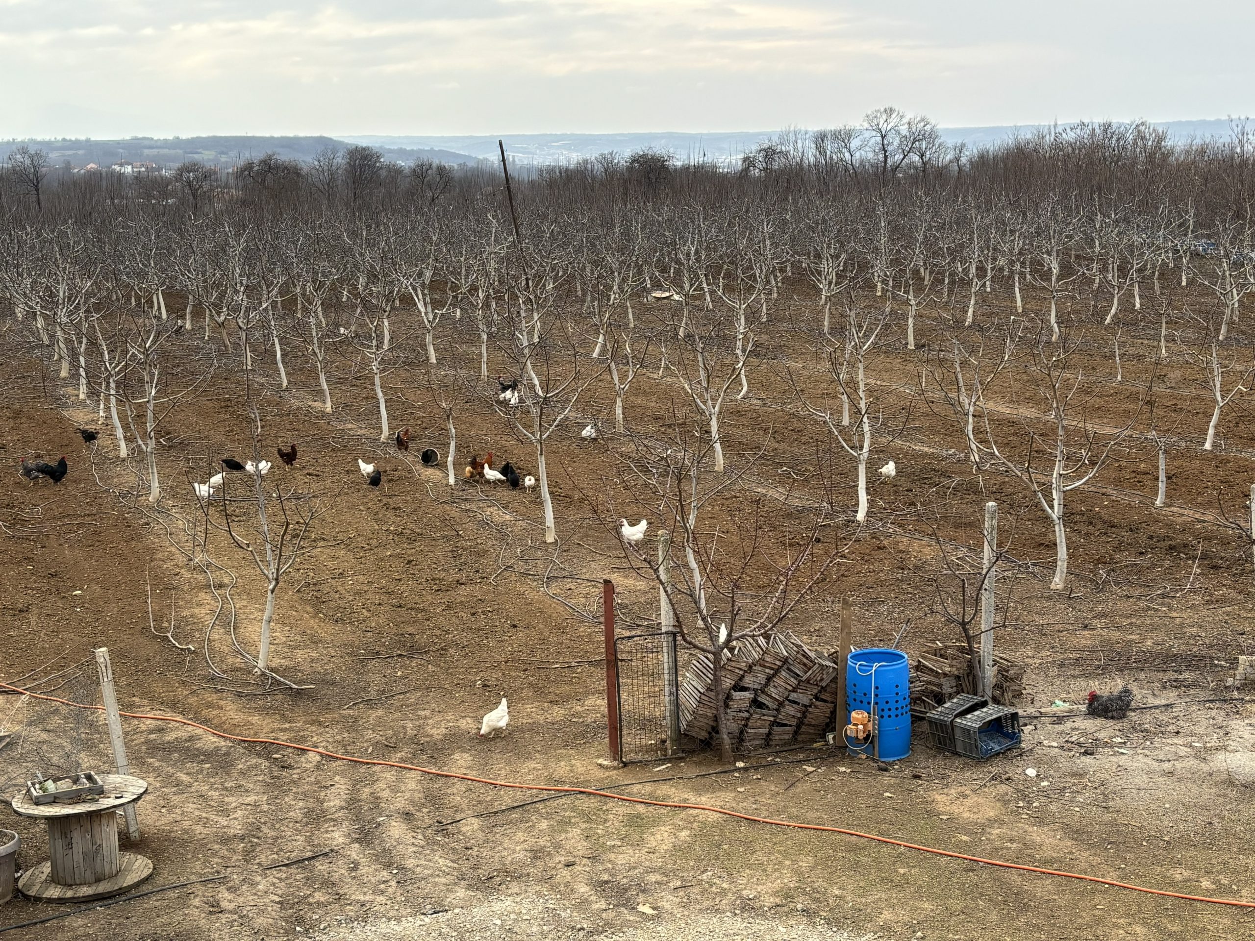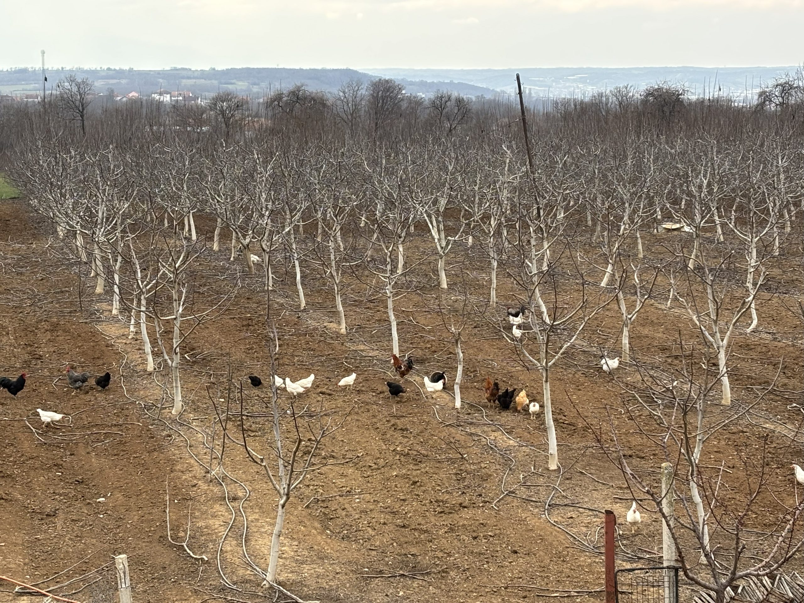Comme de nombreuses exploitations agricoles au Kosovo, cette ferme des environs de Suharekë mise sur la diversification. Entre les dizaines de noyers plantés récemment, des poulets élevés en plein air pâturent librement.