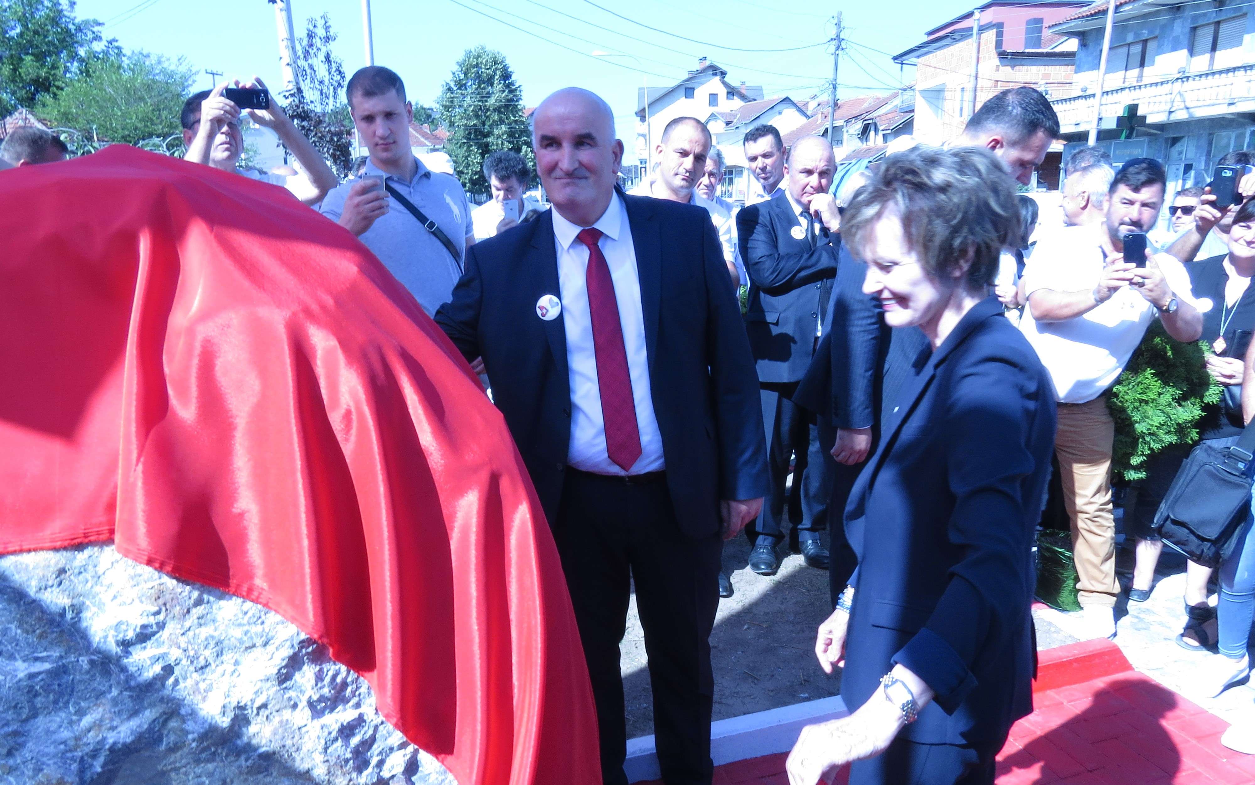 Le moment le plus solennel et le plus émouvant de la visite fut lorsque que Mme Micheline Calmy-Rey découvrit sous la toile rouge la plaque sur laquelle était gravé son nom. C’est avec émotion qui Mme Calmy-Rey a remercié chaleureusement le maire Haliti ainsi que les habitants de la commune de Viti.