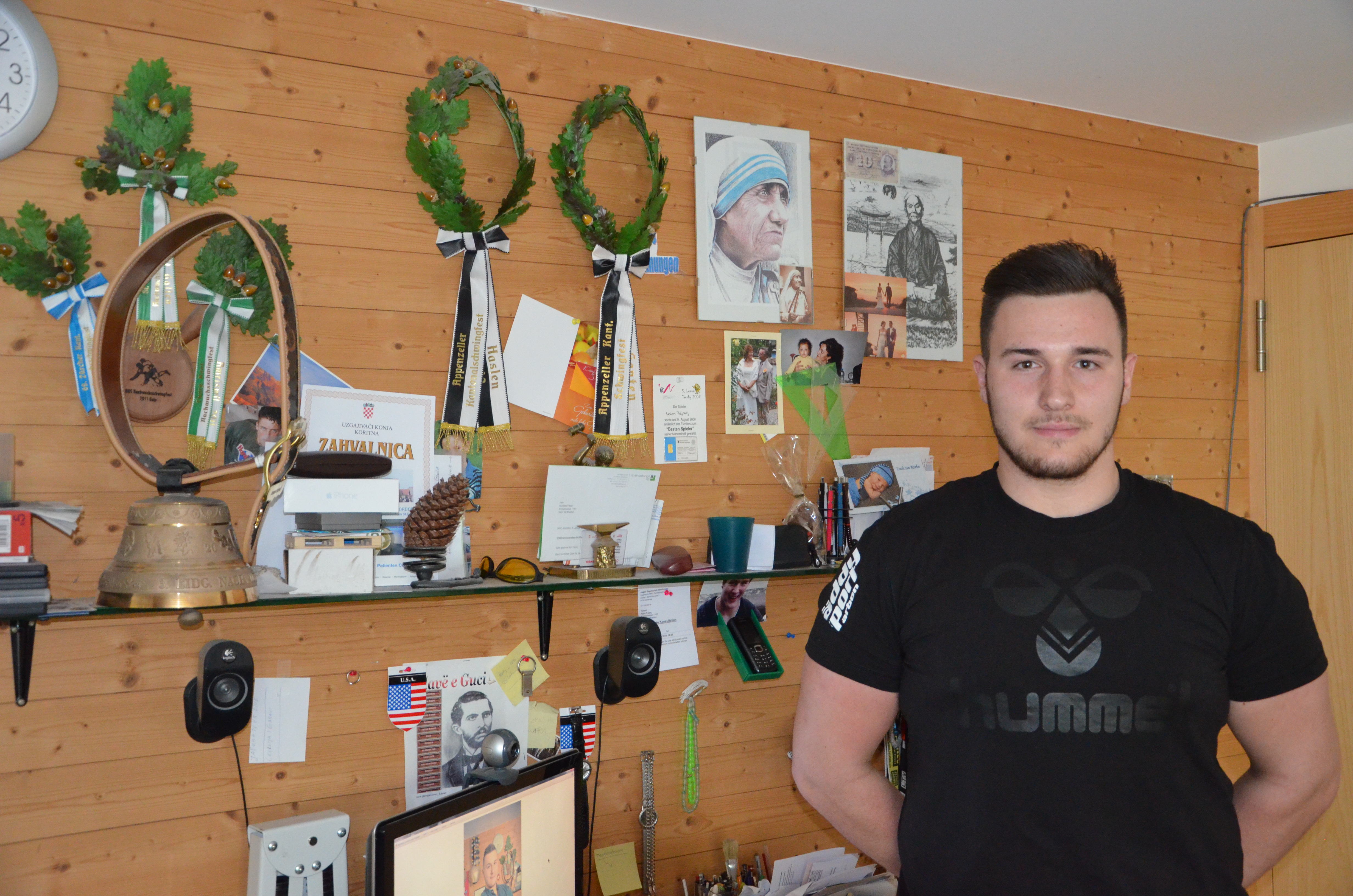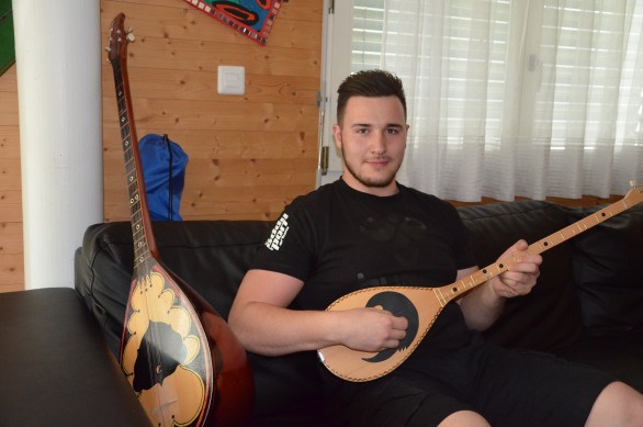 Près de ces instruments, Naim Fejzaj a aligné des dizaines de médailles et de trophées gagnés lors des épreuves d’un sport que les montagnards suisses connaissent bien, le Schwingen. À côté des médailles se trouve le portrait de l’humaniste albanaise, Mère Theresa, les vers de Naim Frashëri, « Plavë e Guci », mais il y a aussi le drapeau croate et un emblème suisse. Naim parle couramment Albanais. « C’est mon père qui me l’a appris » dit-t-il. « Avec lui on s’exprime en Albanais, avec ma mère en Croate et en dehors de chez moi en Suisse allemand ».