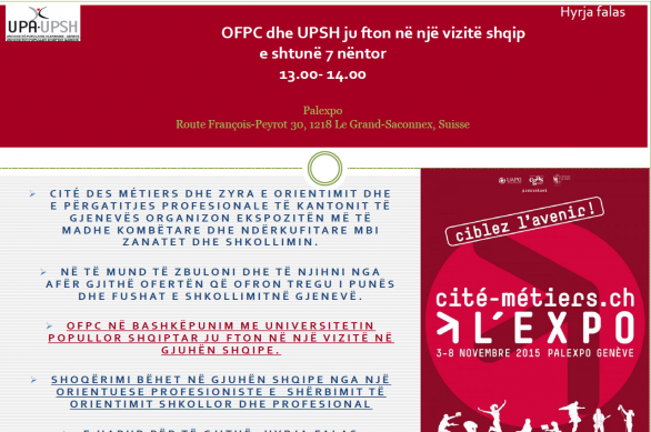 L’OFPC et la cité des métier de Genève, organisent, en collaboration avec l’UPA , une visite guidée en albanais dans le cadre de l’exposition sur les métiers.
