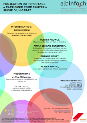 Le 7 juin 2017, à 19h00, salle Le Nouveau Monde, aura lieu la Projection d’un film d’albinfo.ch, suivie de débat sur la Participation des jeunes issus de la Diversité en Suisse, avec Marion AYSANOA, Regula KOHLI-JAVET, Rosita FIBBI, Saâd DHIF.