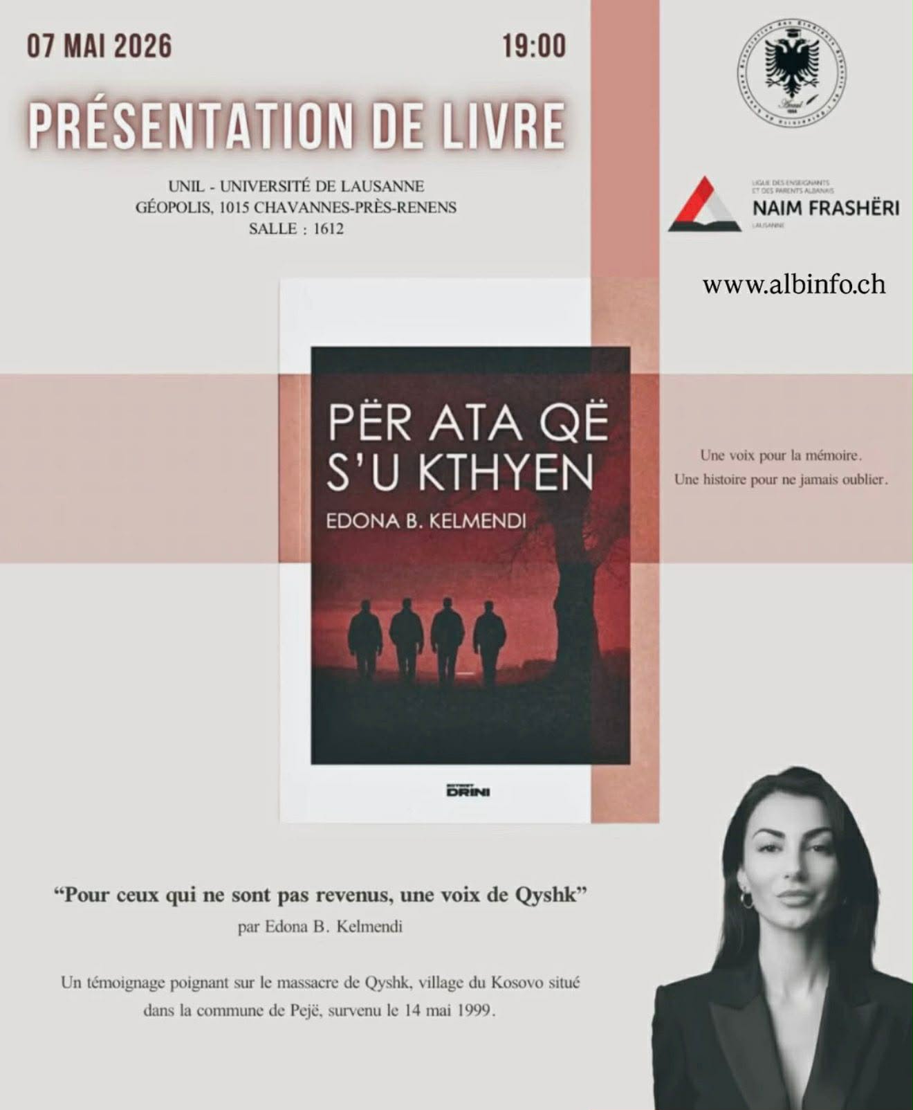 Un événement culturel important pour la communauté albanaise en Suisse aura lieu le 7 mai 2026 à 19h00, à l’Université de Lausanne (UNIL), Géopolis, salle 1612, à Chavannes-près-Renens.