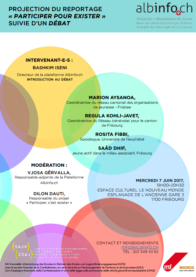 Le 7 juin 2017, à 19h00, salle Le Nouveau Monde, aura lieu la Projection d’un film d’Albinfo.ch, suivie de débat sur la Participation des jeunes issus de la Diversité en Suisse, avec Marion AYSANOA, Regula KOHLI-JAVET, Rosita FIBBI, Saâd DHIF.