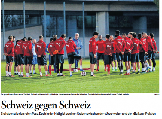 Lojtarët me prindër zviceranë ankohen në bashkëlojtarët e tyre me prejardhje ballkanike se atyre u mungon identifikimi i duhur me kombëtaren (“Nati”). Si shembull përmendin atë se gjithmonë bisedat sillen rreth përzgjhdjes së kombëtares shqiptare. Pastaj abstenimin e tyre nga këndimi i himnit zviceran etj. Paraqitjet publike të Xhakës duke u krenuar me sukseset e kombetares së Shqipërisë ose atletet e Shaqirit me flamurin shqiotar e të Kosovës krahas atij zviceran etj. vetëm sa e kompletojnë këtë sfond. Dhe kjo, sipas gazetës e tëhuajson kombëtaren nga futbolldashësit zviceranë, të cilët nuk duan vetëm rezultate por edhe figura identifikuese.