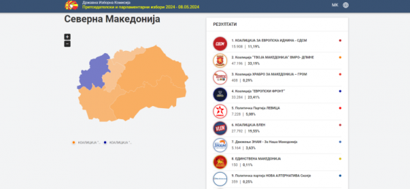 Në bllokun maqedonas prin VMRO -DPMNE me 33,80% ose 58.252 vota, më pas LSDM me 11,31% ose 19.488 votues dhe Levica me 5,14, ndërsa ZNAM me 3,76%.