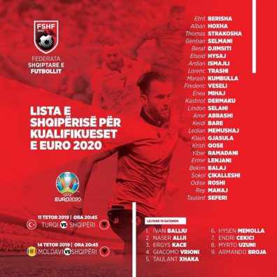 Federata Shqiptare e Futbollit ka publikuar listën e përpliluar nga trajnerin i Kombëtares, Edy Reja, për dy ndeshjet eliminatore të Euro 2020, Turqi-Shqipëri (11 tetor) dhe Moldavi – Shqipëri (14 tetor).