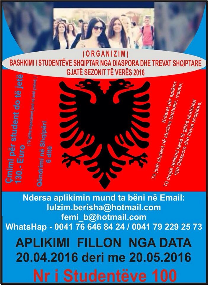 PROJEKT-Organizim nga disa studentë: Bashkimi i Studentëve nga diaspora dhe trevat shqiptare gjatë sezonit të verës 2016 .