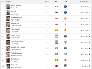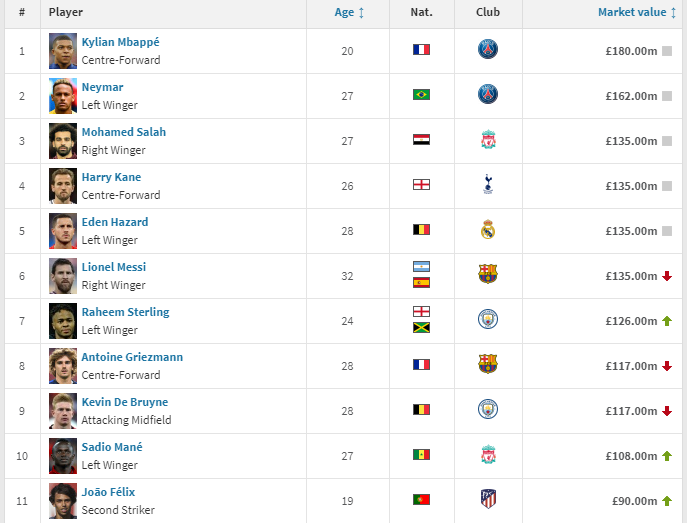 Ai aktualisht vlen 18 milionë funte, duke lënë pas Neymarin me 162 milionë funte, derisa podiumin e plotësojnë katër lojtarë, Lionel Messi, Mohamed Salah, Harry Kane dhe Eden Hazard – vlera e të gjithëve është 135 milionë funte, transmeton Gazeta Express.