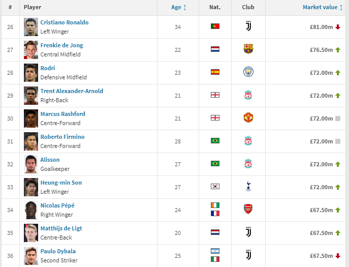 Ronaldo, që brenda pak muajsh (në shkurt të vitit 2020) do t’i mbushë 35 vjet – është vlerësuar si lojtari i 26-të më i vlefshëm në botë, me 81 milionë funte.