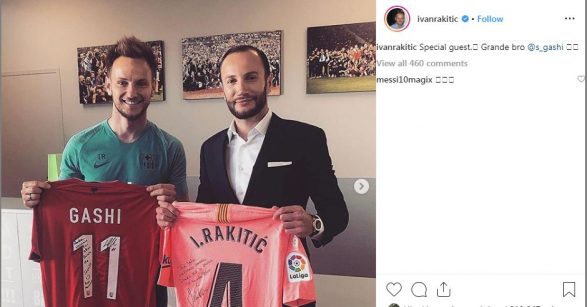 Në fotografinë e postuar duket se dyshja ka shkëmbyer fanellat me njëri-tjetrin, me Rakitiq që ka marrë fanellën me numër 11-të të kombëtares shqiptare, teksa Gashi mori fanellën me numër 4 të Barcelonës.