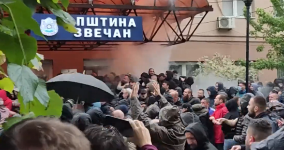 Policia e Kosovës përdori gaz lotsjellës dhe shok-bomba për t’i shpërndarë qytetarët e tubuar para objektit komunal në Zveçan – komunë e banuar me shumicë serbe në pjesën veriore të vendit.