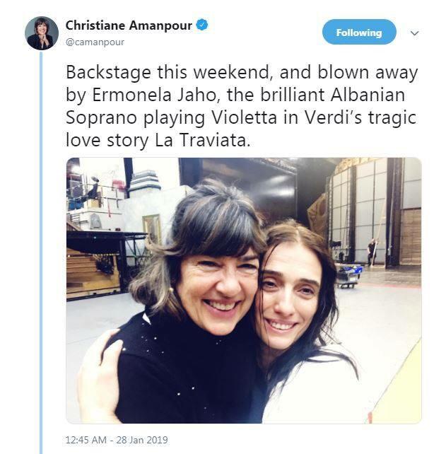 Gazetarja e famshme e “CNN”, Christiane Amanpour, ka realizuar një intervistë për operan “La Traviata” e Giussepe Verdit, pjesë e të cilës është edhe sopranoja shqiptare, Ermonela Jaho.