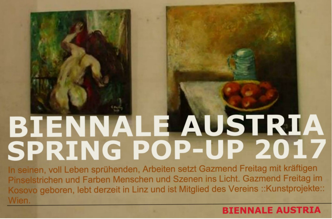 Organizuar nga shoqata e njohur për opromovimin e vlertave artistike “Biennale Austria”, në qendër të Vjenës u hap ekspozita e pikturave nga disa autorë, pjesëtarë të komuniteteve të ndryshme që jetojnë në Austri dhe nga vende tjera. Kësaj radhe me dy piktura: “Akt mit rotem tuch” dhe “Tish” merr pjesë edhe piktori shqiptar Gazmend Freitag i cili jeton në Linz të Austrisë.