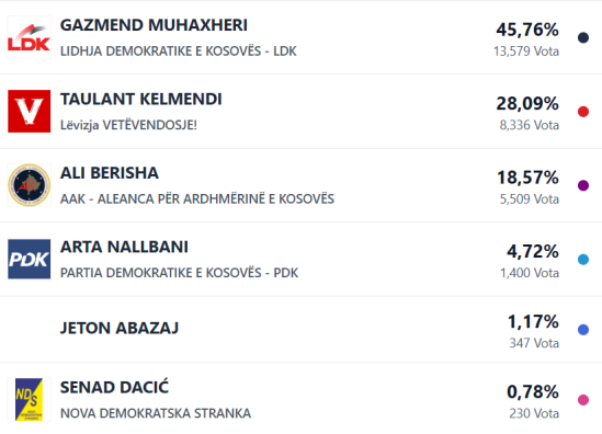 Muhaxheri ka siguruar 45.76 % të votave, duke krijuar një avantazh të dukshëm ndaj kundërkandidatit të Lëvizjes Vetëvendosje! (LVV), Taulant Kelmendi, i cili ka marrë 28.09 % deri më tani.