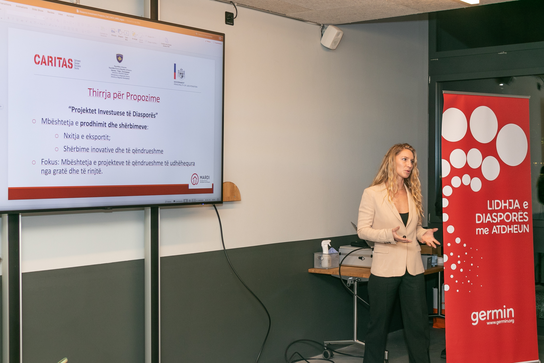 Prezantimi i mekanizmit financiar për projekte investuese nga diaspora është bërë nga Luiza Sekiraqa, menaxhere e projektit MARDI, CARITAS Zvicër. Znj. Sekiraqa ka prezantuar thirrjen e hapur për profesionistët dhe bizneseve nga Zvicra për projekte investuese në kuadër te projektit “Veprimi i Komunave për Riintegrim dhe Diasporë – MARDI” që implementohet nga Caritas-i Zviceran në partneritet me Germin-in.