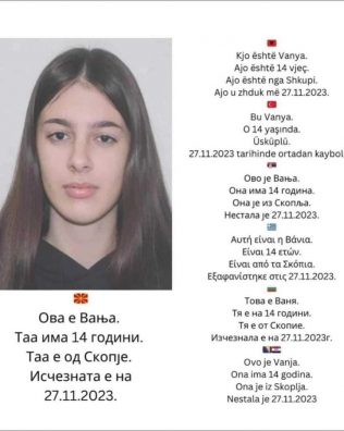 14-vjeçarja Vanja Gjorçevska, që ishte zhdukur para një jave, është gjetur pa shenja jete në Veles.