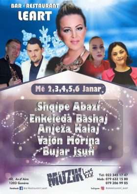 Bar Restaurant Leart organizon një pritje festive për Vitin e ri 2018. Bashkë me një meny special por edhe për ata që dëshirojnë tradicional mysafirët do të mund të argëtohen gjerë në mëngjes me këngëtarë të ndryshëm shqiptarë. Zbuloni më poshtë programin që kemi përgatitur enkas për ju.