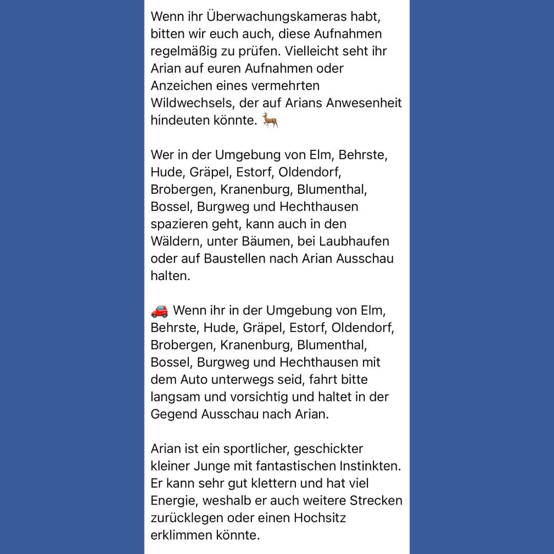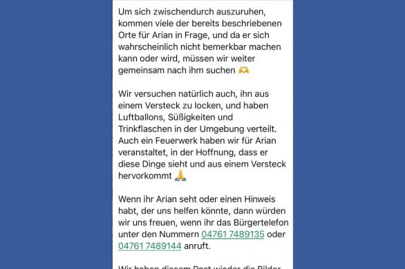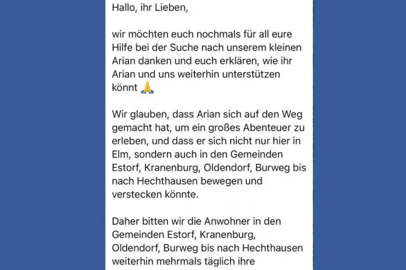 Shpresa e prindërve për të gjetur sërish djalin e tyre të vogël mbetet e pandërprerë. Qindra ndihmës nga brigada e zjarrit, policia dhe Bundeswehr po kërkojnë Arianin 6-vjeçar nga Bremervörde-Elm.
