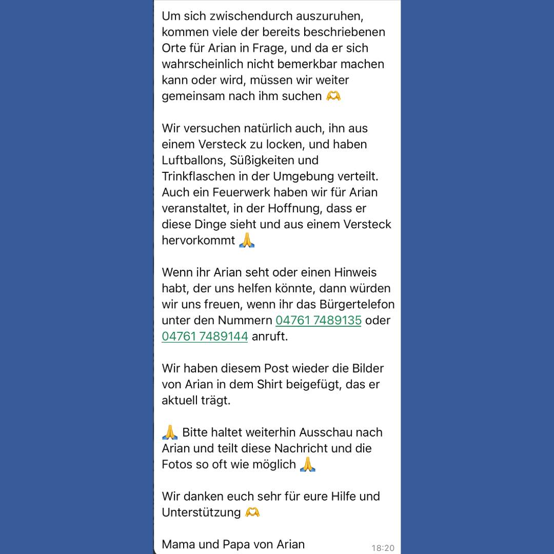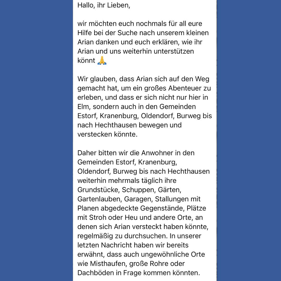 “Dëshirojmë t’ju falënderojmë përsëri për të gjithë ndihmën tuaj në gjetjen e Arianit tonë të vogël. Ne besojmë se Ariani u nis për të përjetuar një aventurë të madhe”. Prandaj familja supozon se djali autik jo vetëm që mund të ishte në afërsi të shtëpisë së tij në Elm, por ka ardhur shumë më tej.