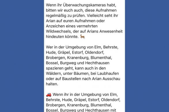 “Prandaj ne kërkojmë nga banorët në komunitetet e Estorf, Kranenburg, Oldendorf, Burweg deri në Hechthausen që të vazhdojnë të kontrollojnë rregullisht pronat e tyre, kasollet, kopshtet, belvederët (…) disa herë në ditë”.