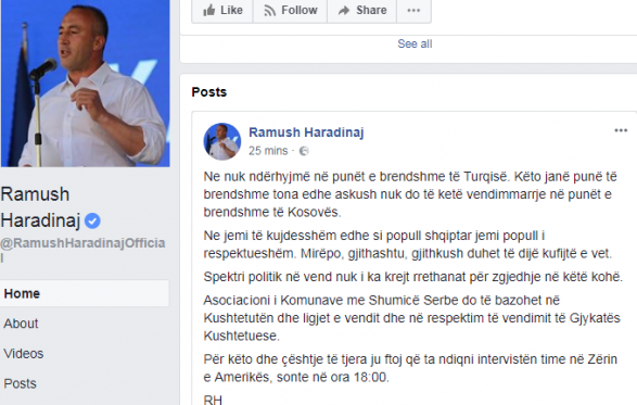 Ndërsa në facebook ka shkruar se: “Ne nuk ndërhyjmë në punët e brendshme të Turqisë. Këto janë punë të brendshme tonat edhe askush nuk do të ketë vendimmarrje në punët e brendshme të Kosovës”.