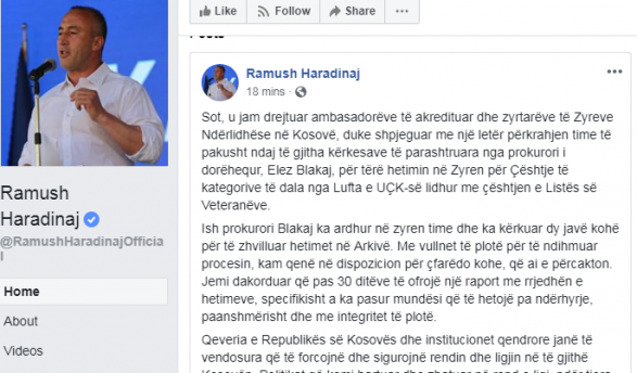 Kryeministri Ramush Haradinaj ka publikuar në profilin e tij në Facebook letërkëmbimin që ka pasur me prokurorin që hetonte veteranët Elez Blakaj. Haradinaj thotë se u është drejtuar ambasadorëve të akredituar dhe zyrtarëve të Zyreve Ndërlidhëse në Kosovë, ku i ka shpjeguar me një letër përkrahjen e tij të pakusht ndaj të gjitha kërkesave të parashtruara nga prokurori i dorëhequr, Elez Blakaj, për tërë hetimin në Zyrën për Çështje të kategorive të dala nga lufta e UÇK-së lidhur me çështjen e listës së veteranëve.