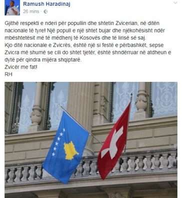 “Gjithë respekti e nderi për popullin dhe shtetin Zviceran, në ditën nacionale të tyre. Një popull e një shtet bujar dhe njëkohësisht ndër mbështetësit më të mëdhenj të Kosovës dhe të lirisë së saj. Kjo ditë nacionale e Zvicrës, është një si festë e përbashkët, sepse Zvicra më shumë se cili do shtet tjetër, është shndërruar në atdheun e dytë për qindra mijëra shqiptarë – Zvicër me fat”, ka shkruar Haradinaj në profilin e tij në Facebook.