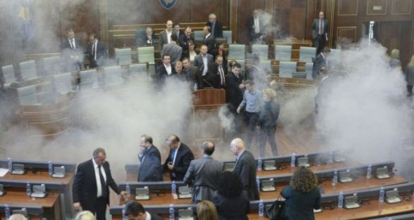 Gazi lotsjellës është kthyer sërish në Kuvendin e Kosovës. Në momentin kur po pritej që të votohej për ratifikimin e demarkacionit me Malin e Zi, deputetët e Vetëvendosjes kanë hedhur dy bombola me gazë lotsjellës gjë që bëri të ndërpritet seanca, përcjell albinfo.ch.