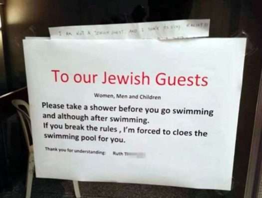 “Mysafirëve tanë hebrenj: Ju lutemi bëni dush para dhe pas notit në pishinën tonë”. Kjo porosi ka ngjallur reagime të ashpra në Izrael, ku është cilësuar si fyerje antisemitiste