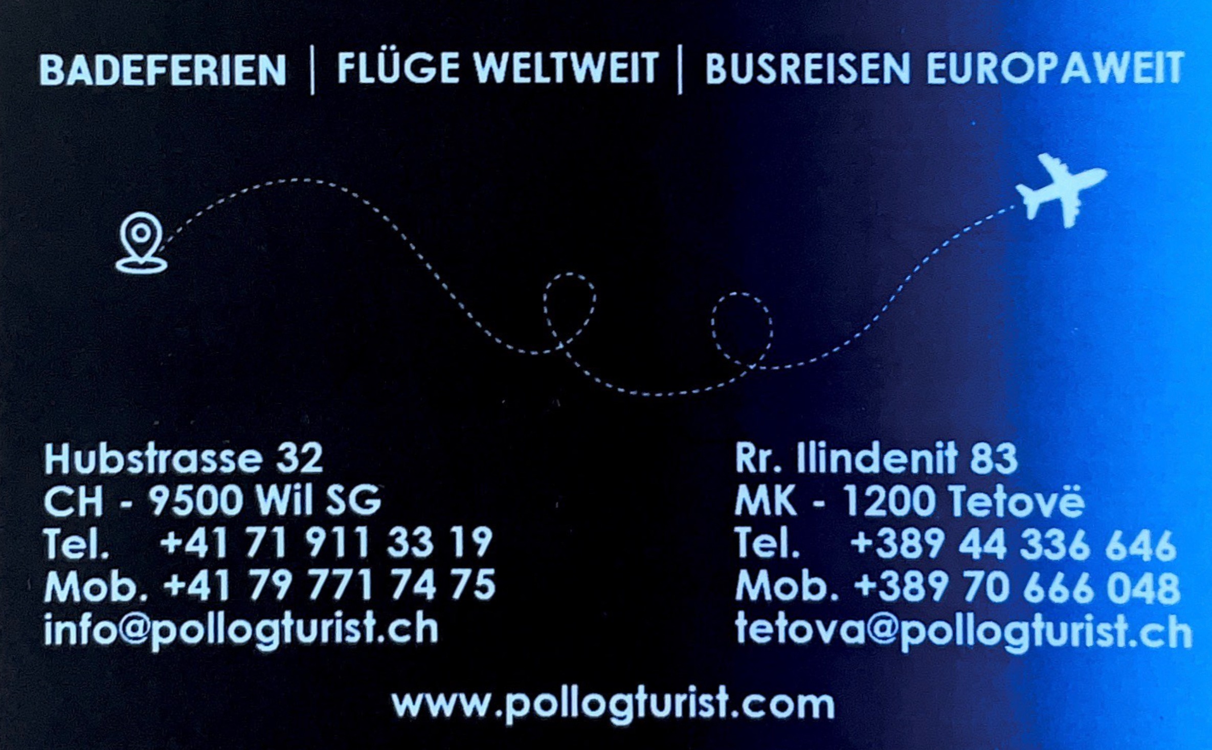 Paketat turistike të agjensionit turistik shqiptar janë konkurruese me agjencionet më të njohura zvicerane dhe ju ato mund ti rezervoni direkt në zyrat e agjencionit në qytetin Wil apo ta bëni rezervimin online. Agjencioni turistik ka zyrat në Zvicër dhe në Maqedoni. Mirëpo, shërbimet online të paketave tursitike në të gjitha vendet e botës janë ato që bëjnë diferencën e shërbimeve të shpejta e cilësore. Ju mund ti krahasoni ofertat aty për aty, ta zëmë për një pushim në Antalya, Mallorca, Dubai apo Kreta.