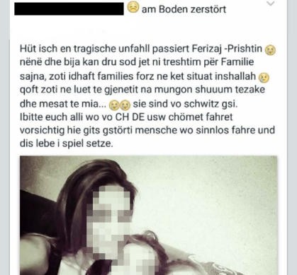 Ndër të tjera ajo u publikua në faqen “Du bisch Albaner wenn” (Je shqiptar nëse) e cila ka 26.000 ndjekës. “Sot ka ndodhur një aksident tragjik në rrugën Ferizaj – Prishtinë. Me këtë rast kanë humbur jetën nëna dhe vajzat e saj. Një tronditje e madhe për familjen. I dhashtë zoti forcë familjes në këtë situatë”, është shkruar atxy në një përzierje në mes të shqipes (dialekt) dhe gjermanishtes së Zvicrës. Brenda të njëjtit tekst është futur edhe një lutje: “Të gjithë ju që vini nga Zvicra, Gjermania etj, ju lutemi të vozitni më me kujdes. Këtu ka njerëz me çrregullime që ngasin veturat pa mend dhe e vejnë në rrezik jetën tënde”.