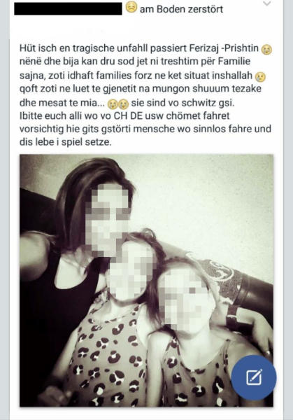 Ndër të tjera ajo u publikua në faqen “Du bisch Albaner wenn” (Je shqiptar nëse) e cila ka 26.000 ndjekës. “Sot ka ndodhur një aksident tragjik në rrugën Ferizaj – Prishtinë. Me këtë rast kanë humbur jetën nëna dhe vajzat e saj. Një tronditje e madhe për familjen. I dhashtë zoti forcë familjes në këtë situatë”, është shkruar atxy në një përzierje në mes të shqipes (dialekt) dhe gjermanishtes së Zvicrës. Brenda të njëjtit tekst është futur edhe një lutje: “Të gjithë ju që vini nga Zvicra, Gjermania etj, ju lutemi të vozitni më me kujdes. Këtu ka njerëz me çrregullime që ngasin veturat pa mend dhe e vejnë në rrezik jetën tënde”.