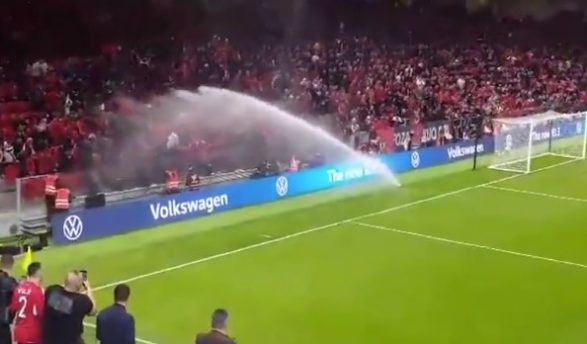 Dy nga hedhëset e ujit, siç shihet edhe nga foto, janë shumë afër me tifozët, dhe lagin ata që gjenden në tribunën pas porte.