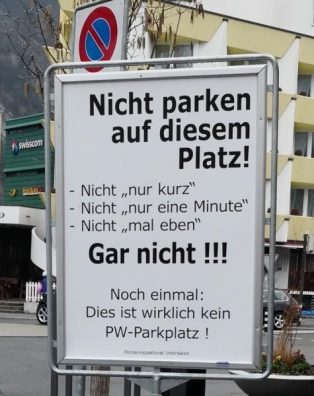 Në këtë mënyrë, në tërë qytezën janë të vendosura shenja të tilla. Parkimi i gabuar në rrugën “Bahnhofstrasse” është paralajmëruar në këtë mënyrë: “Mos u parkoni në këtë vendparkim! Jo vetëm shkurt. Jo vetëm një minutë. Bile edhe më pak. Aspak!!! Edhe një herë: Ky, vërtetë nuk është vendparkim për vetura!”. Ky aksion me frymë humori ka ndikuar dukshëm: “Me këtë shenjë, është konstatuar se asnjë veturë më nuk është parkuar në vijat e verdha”.