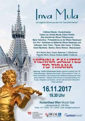 Kryeqyteti Austriak, Vjena, sonte do të frymojë shqip. Në sallën prestigjioze “Mozart Saal” në Vjenë duke filluar nga ora 19.30 do të mbahet koncerti “Vjena përshëndet Tiranën”. Në këtë koncert që përkon me 105 vjetorin e shtetit shqiptar, do të këndojnë dhe vallëzojnë artistët shqiptarë më renome ndërkombëtare, siç janë: sopranoja me famë botërore, Inva Mula, pianisti Genc Tukiçi, baritoni Gëzim Myshketa, violinisti Olen Cezari e shumë artistë tjerë të njohur të muzikës shqiptare në botë, njofton “albinfo.ch”.