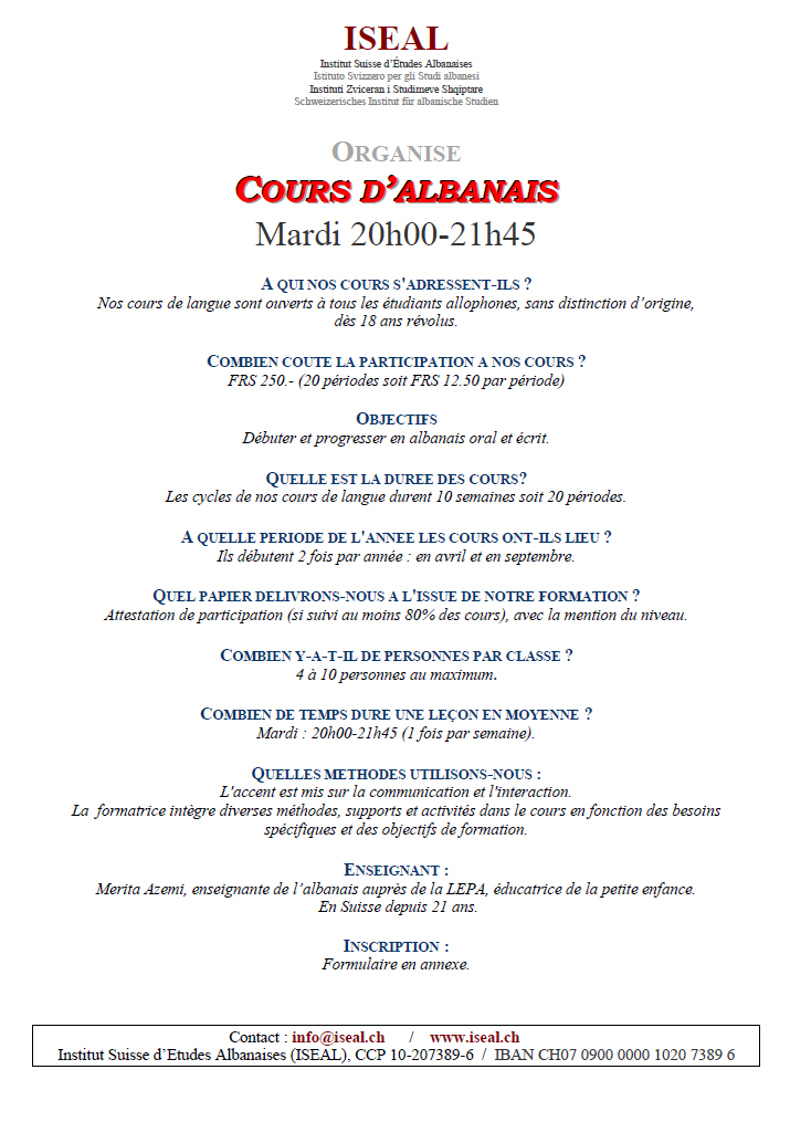 Dès le mardi 21 avril 2015, ISEAL organise également des cours d’albanais.