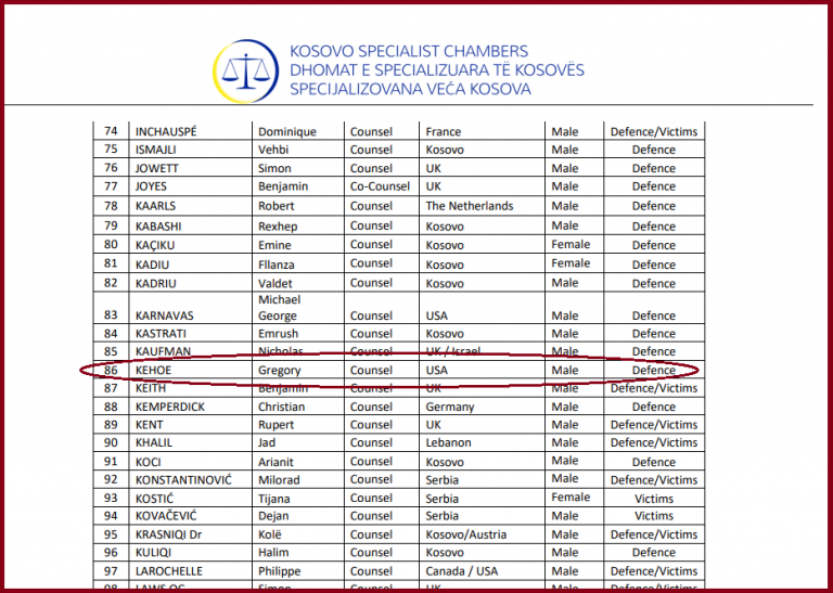 Dhomat e Specializuara të Tribunalit të Hagës, tashmë kanë vendosur emrin e Gregory W.Kehoe në listën e avokatëve të akredituar të këtij institucioni, njoftojnë mediat kosovare, transmeton albinfo.ch.