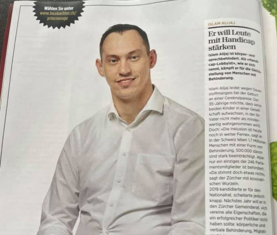 Islam Alijaj është një 35 vjeçar me aftësi të kufizuara nga Cyrihu, i njohur për angazhimin e tij në jetën politike të Cyrihut dhe më gjerë, shkruan albinfo.ch. Ai lufton për barazi për personat me aftësi të kufizuara ndërsa së fundi është nominuar nga revista “Beobachter” për të marrë Prix Courage 2021.