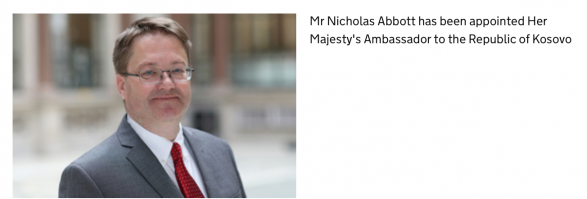 Nicholas Abbott është emëruar Ambasador i Britanisë së Madhe në Republikën e Kosovës. Ambasada e Britanisë zyrtarisht ka njoftuar se Abbot do ta zërë vendin e ambasadorit aktual, Ruairi O’Connell.