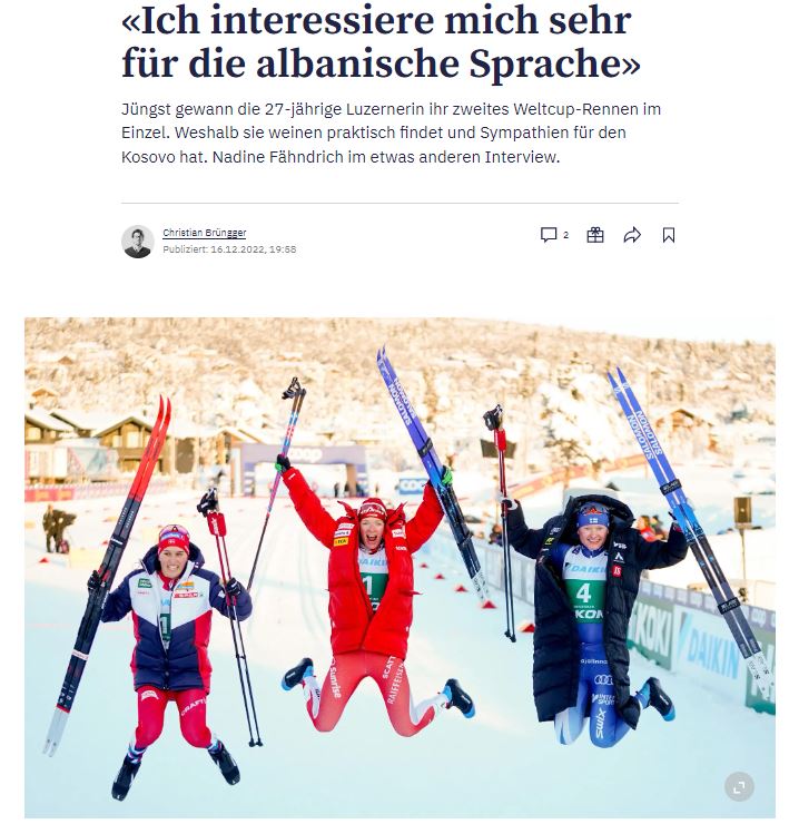 Nadine Fähndrich është aktualisht mbase skitarja më e suksesshme e Zvicrës. 27-vjeçarja nga Lucerni fitoi së fundmi garën e saj të dytë individuale të Kupës së Botës, transmeton albinfo.ch. Kjo ishte një arsye më shumë për gazetën Tages Anzeiger që të zhvillojë një intervistë (më ndryshe) me të.
