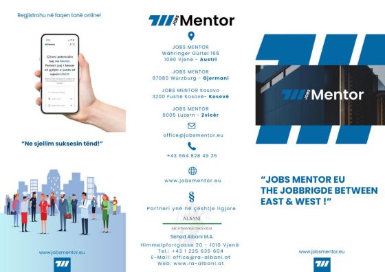 Jobsmentor.eu është një platformë dixhitale që ndihmon profesionistët dhe kërkuesit e punës të gjejnë mundësitë më të mira në rajonin DACH (Gjermani, Austri, Zvicër) dhe më gjerë. E krijuar nga një bashkëpunim i bizneseve të suksesshme në Austri, Zvicër dhe Gjermani, platforma ndihmon në ndërtimin e urave lidhëse mes Europës Lindore dhe Perëndimore dhe ofron mundësi të shkëlqyera në tregun e punës.