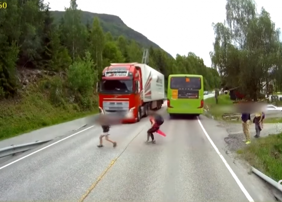 Aty shihet se si një kamion ndalet në sekondat e fundit për t’i ikur shtypjes së një fëmije që kishte zbritur në anën tjetër të rrugës nga një autobus